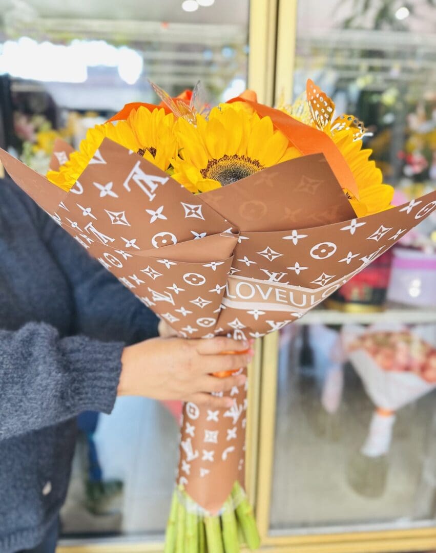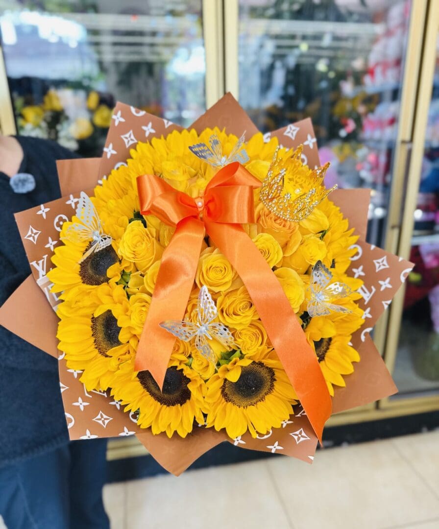 Beautiful buchon bouquet with 25 yellow roses and 10 sunflowers, finely wrapped and decorated with butterflies, a crown and a ribbon. Designed by New York Flowers