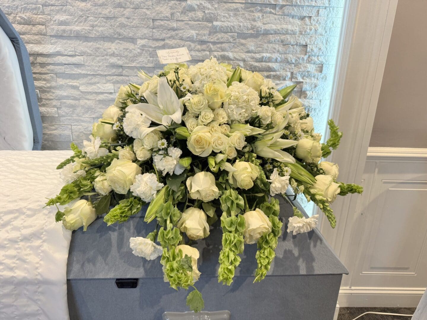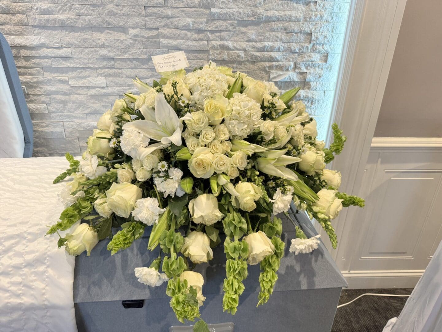 Beautiful mixture of white flowers that express the most sincere condolences. White lilies, hydrangeas, roses, spray roses, carnations, stock, snapdragons and bell of Ireland.  Measures: 12”H x 36” W. Designed by New York Flowers