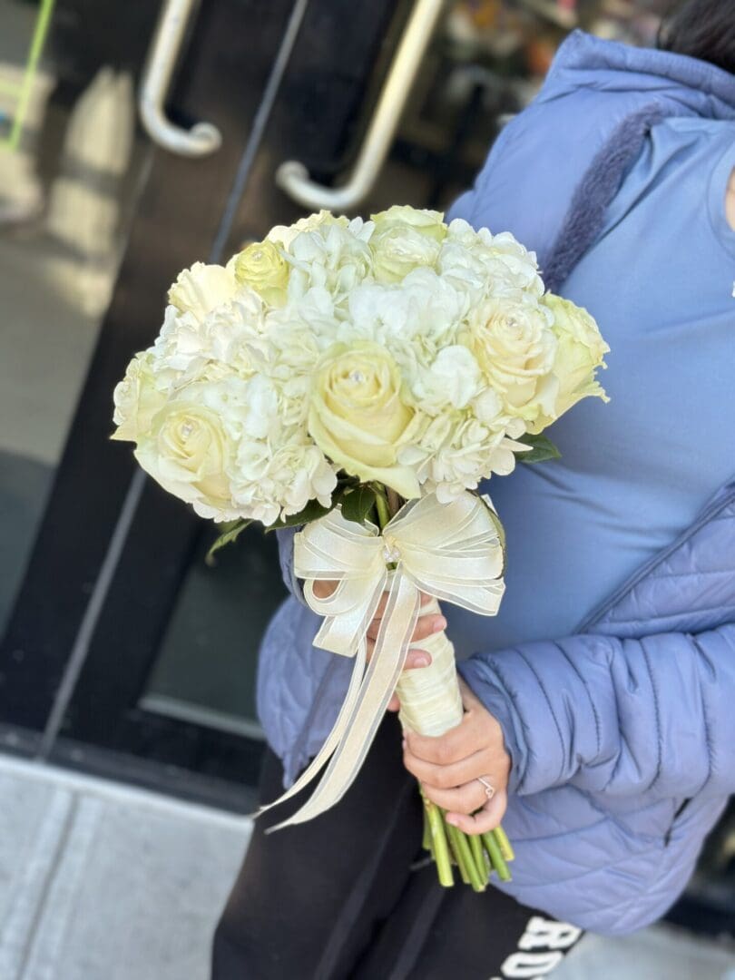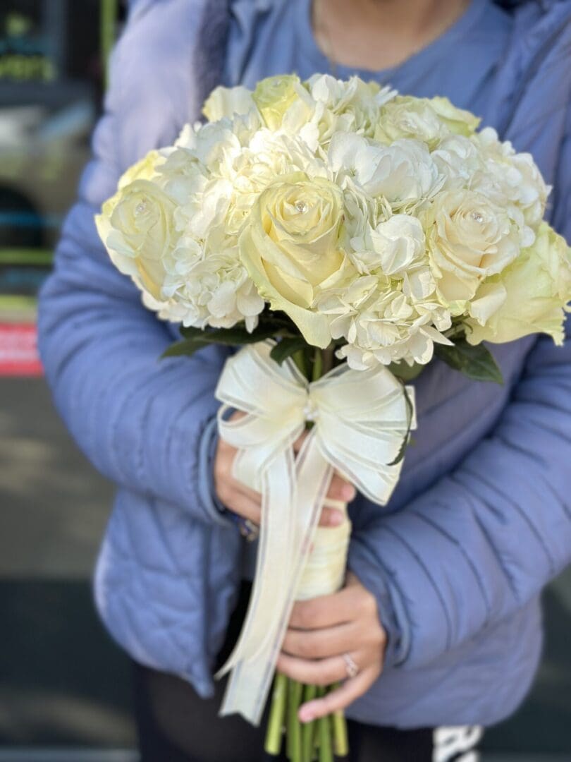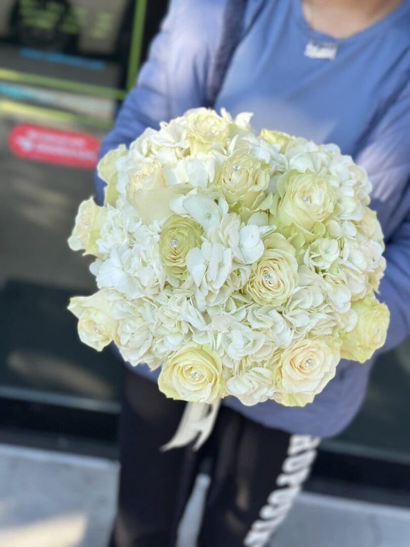 White Hydrangea-White Rose Bouquet. This classic combination of light white hydrangeas and creamy white roses remind you of warm summer days. The perfect combination for this very special day you’ve always dreamed of (approximately 12 to 15 roses and 4 to 6 white hydrangeas). Designed by New York Flowers