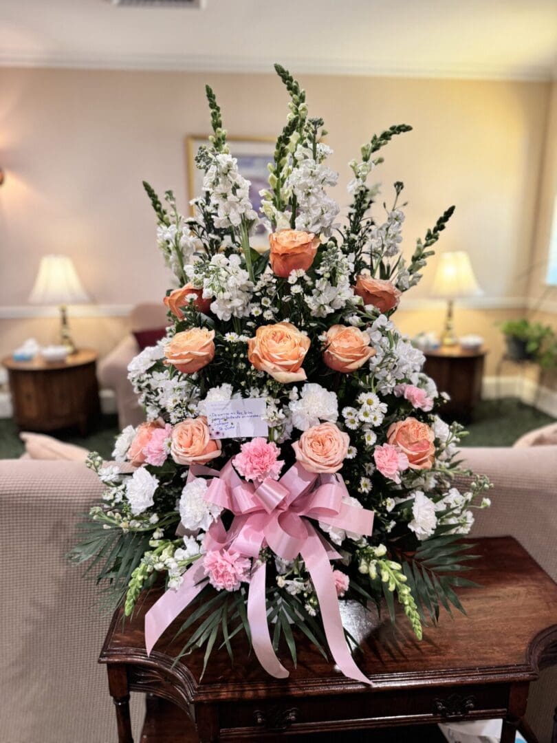 Soothing pink and white flowers are gathered into a one-sided fan-shaped arrangement to sit elegantly on the floor, mix of roses, carnations, snapdragons, stock in pastel colors and greenery. Measures approx 30”Hx 24”W. Designed by New York Flowers