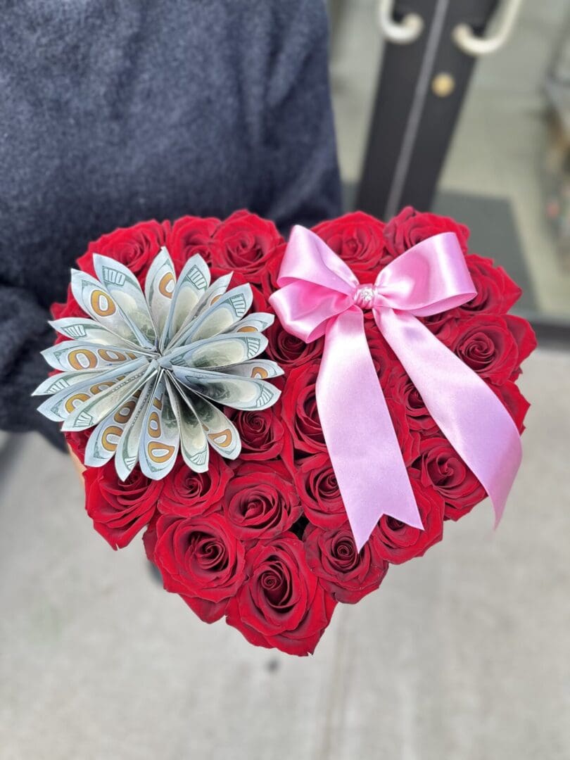 Beautiful long-stemmed Red Roses, arranged in a modern white heart hatbox. Arrangement contains approximately 20 to 25 fresh natural roses, It does not include the money used to make the flower; the customer has to provide the money, and the charge is only for making the flower plus the price of the roses in the box. Designed by New York Flowers