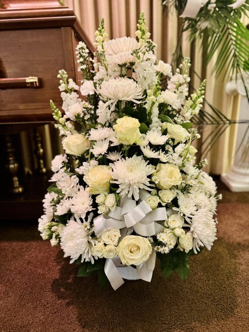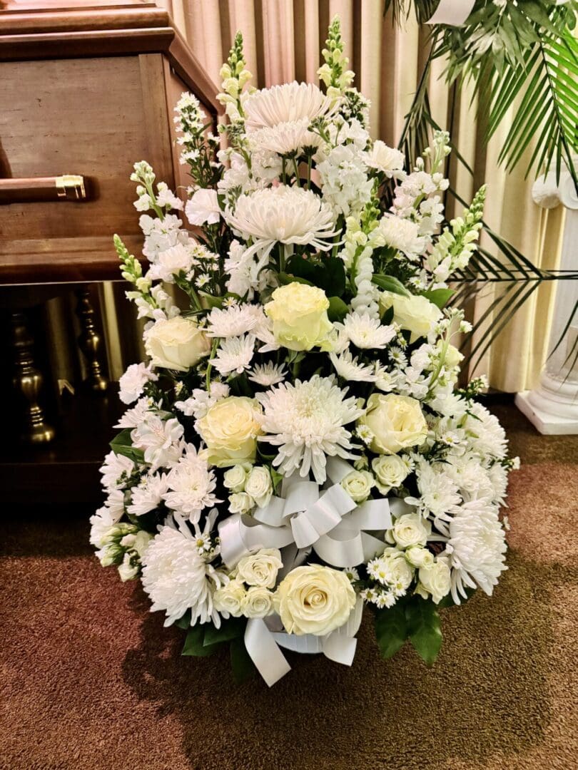 Classic and pure, this white funeral basket is a beautiful, filled with mix white flowers and fillers and glad to make for a beautiful full white funeral basket for the funeral service. Designed by New York Flowers