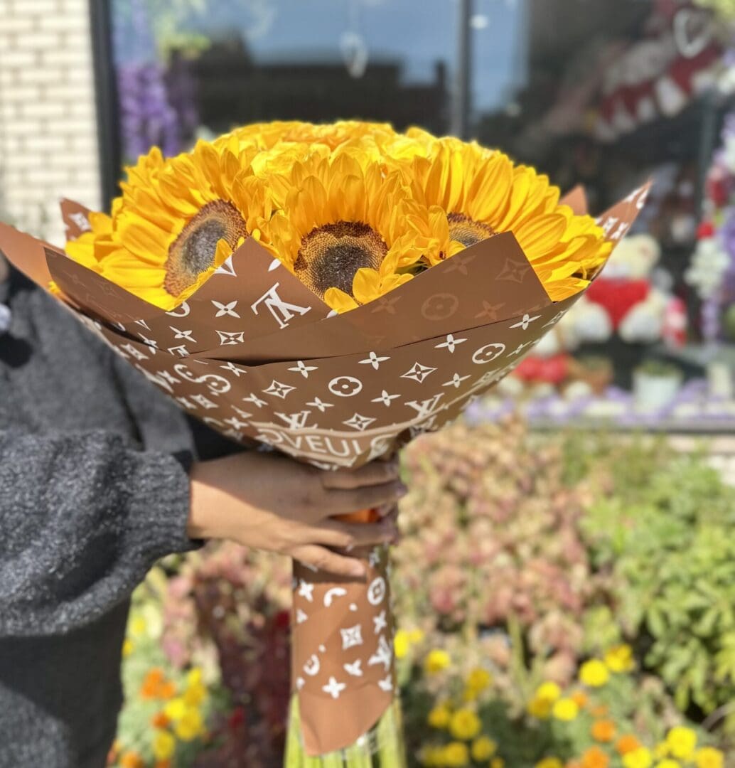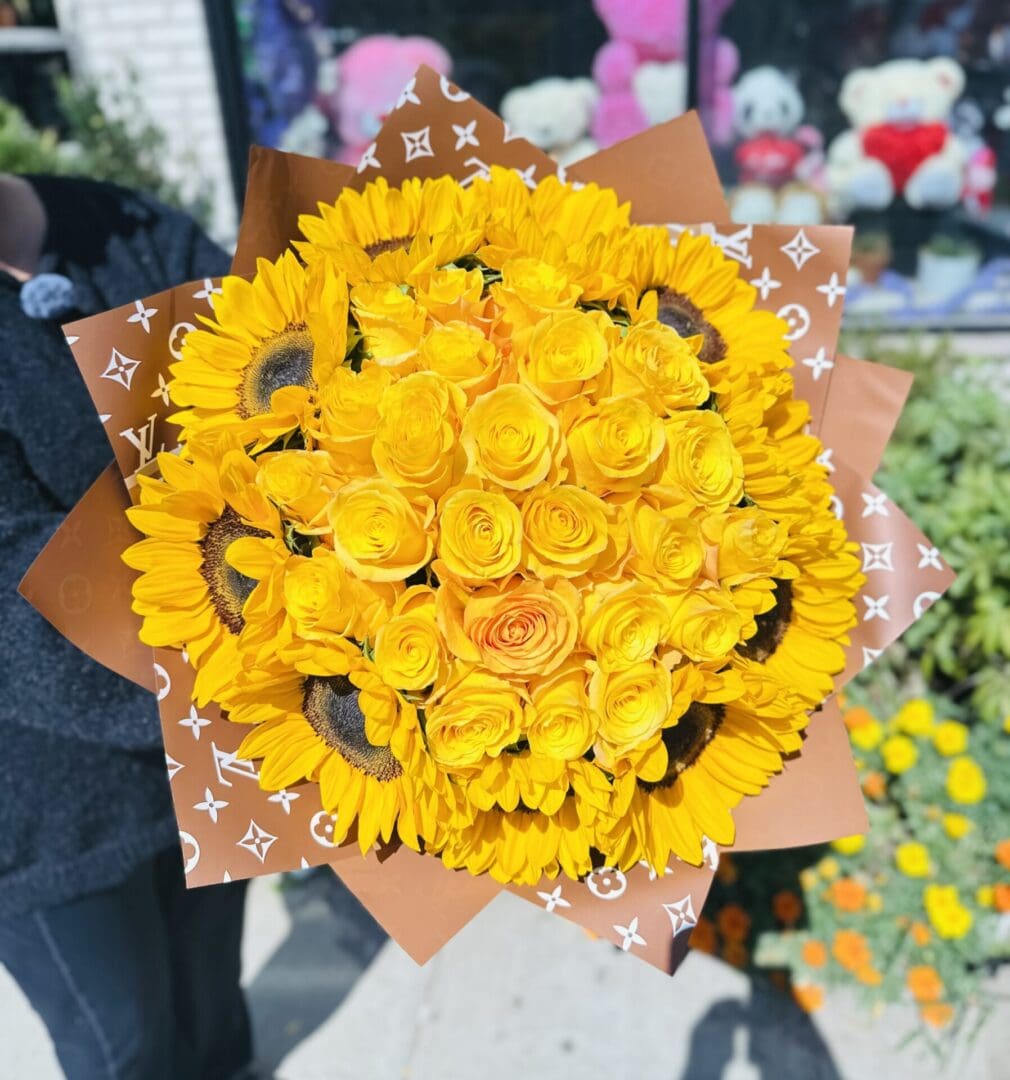 Beautiful, finely wrapped buchon bouquet with 25 yellow roses and 10 sunflowers. Designed by New York Flowers.